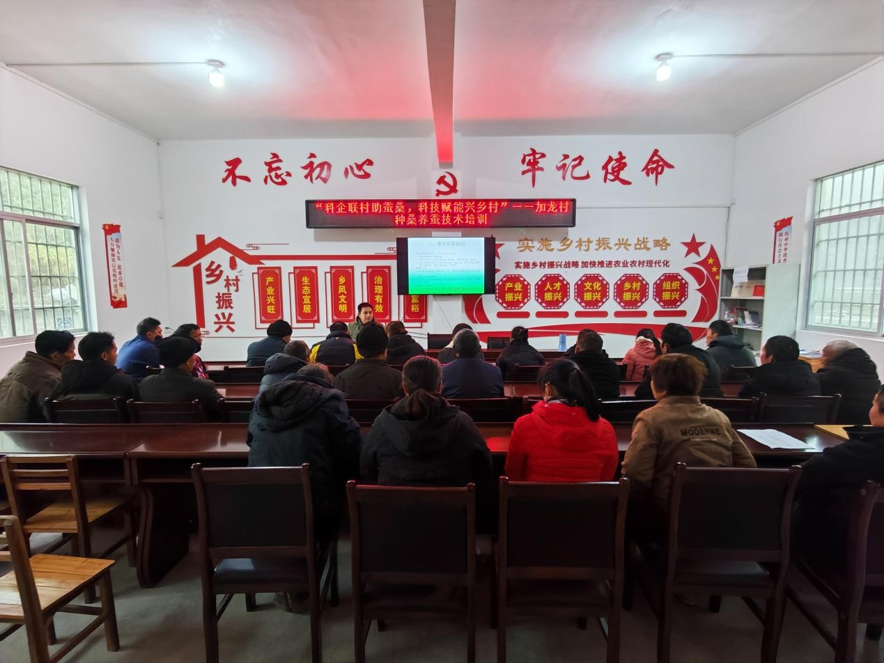 1月22日,加龍村舉辦了種桑養(yǎng)蠶技術培訓會。來自河池市農(nóng)業(yè)科學研究所的專家團隊走進村里,圍繞桑樹種植、養(yǎng)蠶管理等實際問題,為村民進行現(xiàn)場講解和指導。