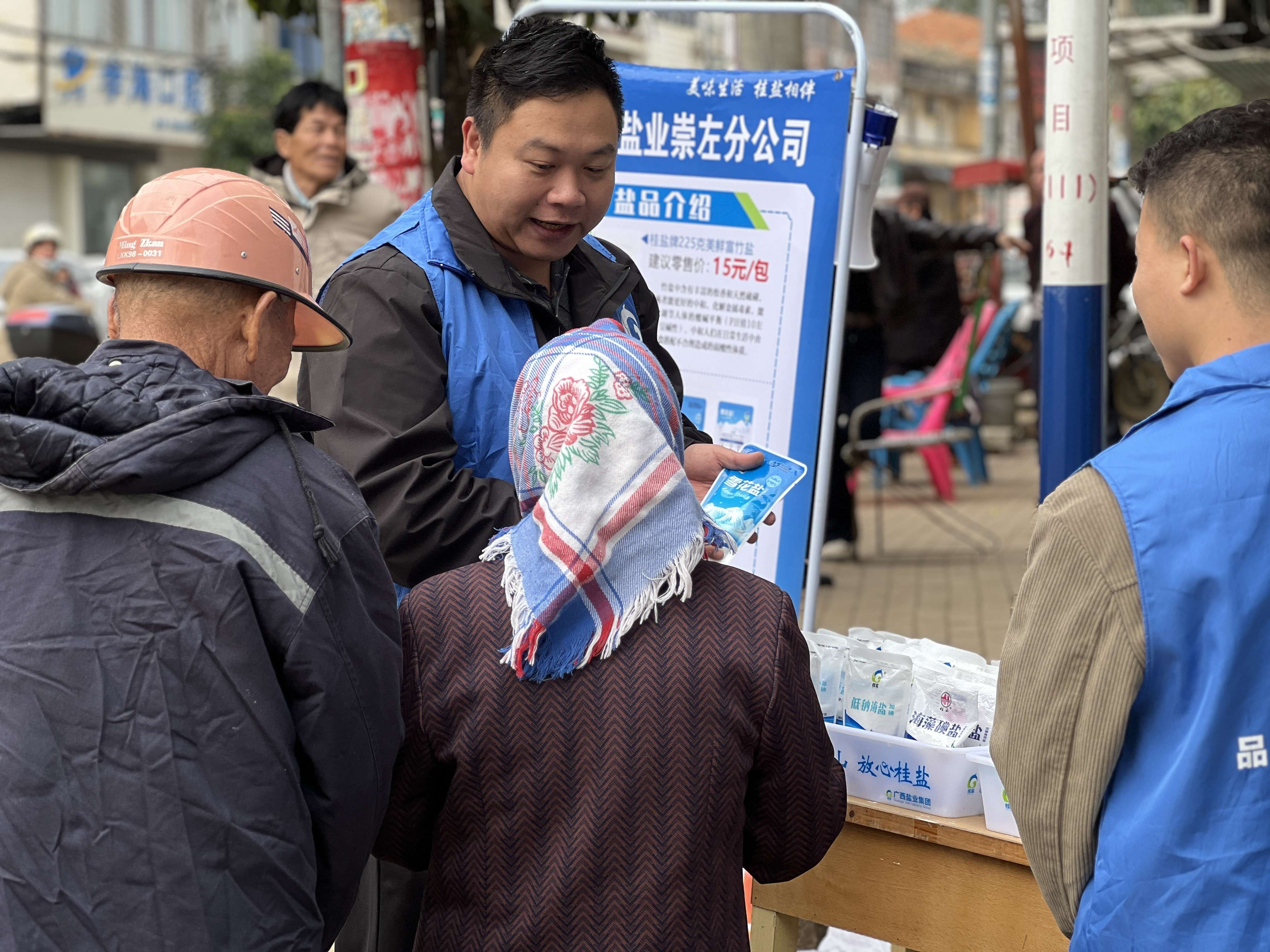 搶花炮決賽后,廣西鹽業(yè)集團崇左分公司巧妙地在巡游的必經(jīng)之路上擺攤設點開展地推活動,借著熱鬧的人流,讓四方聞訊而來的民眾在沉浸式體驗民族傳統(tǒng)節(jié)日魅力的同時,還能深入了解健康用鹽知識,進一步了解“桂鹽”“桂山”品牌。